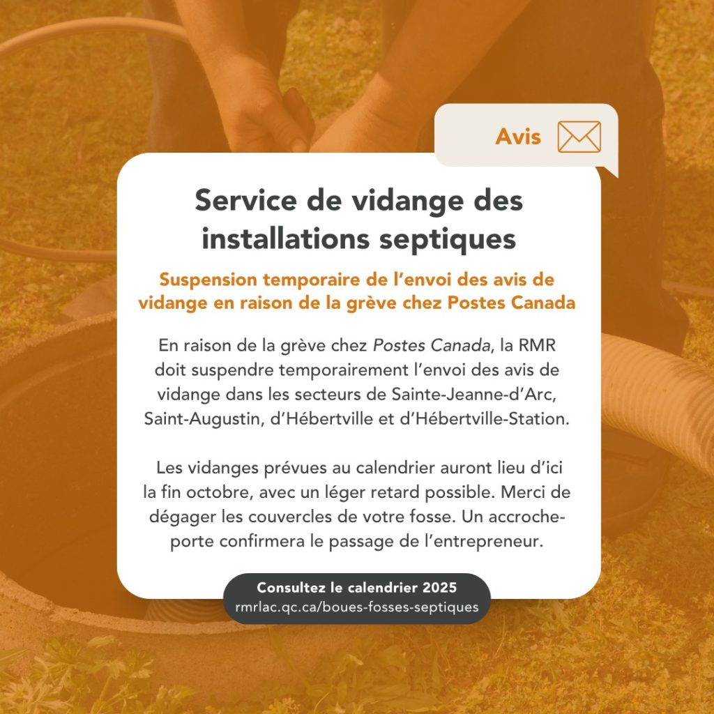 En raison de la grève de Postes Canada, l’envoi des avis de vidange est suspendu pour les secteurs suivants : Municipalité de Sainte-Jeanne-d’Arc, Municipalité de Saint-Augustin Dalmas, Municipalité Hébertville et la Municipalité d’Hébertville-Station.